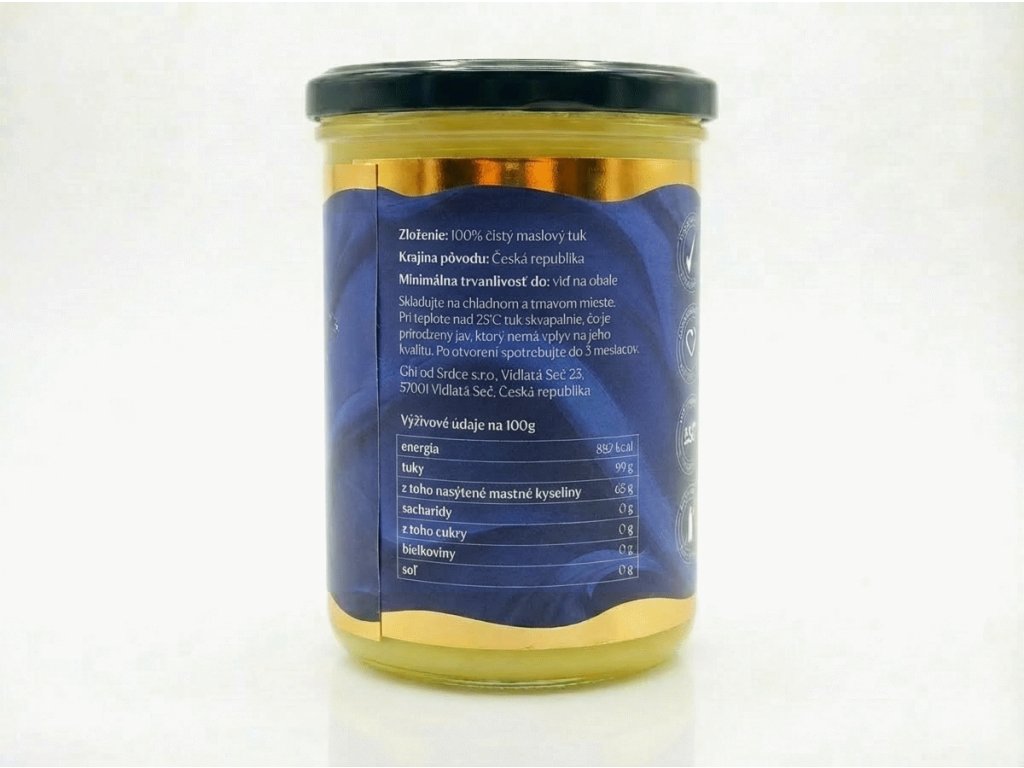 Skladujte na chladnom a tmavom mieste. Pri teplote nad 25 °C tuk skvapalnie, čo je prirodzený jav, ktorý nemá vplyv na jeho kvalitu. Ghi od Srdce s.r.o., Vidlatá Seč 23, 57001 Vidlatá Seč, Česká republika
