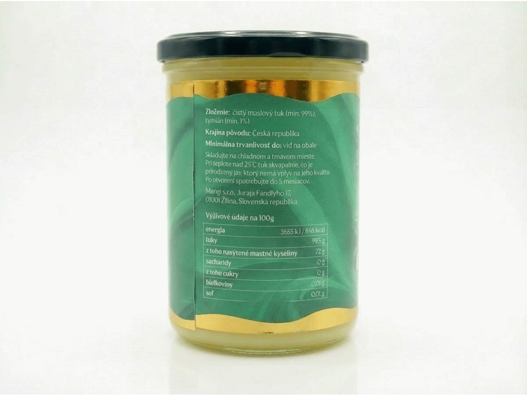 Skladujte na chladnom a tmavom mieste. Pri teplote nad 25 °C tuk skvapalnie, čo je prirodzený jav, ktorý nemá vplyv na jeho kvalitu. Ghi od Srdce s.r.o., Vidlatá Seč 23, 57001 Vidlatá Seč, Česká republika